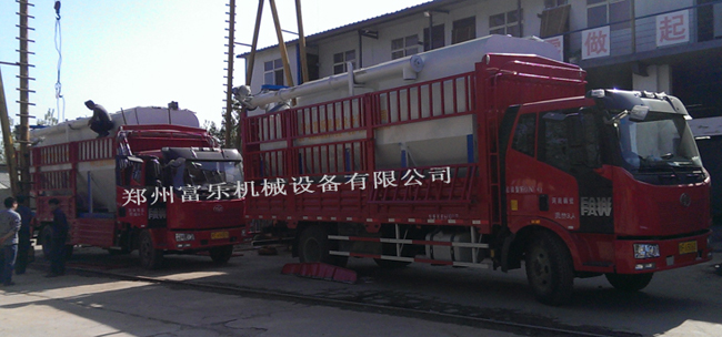 鄭州富樂機械設(shè)備有限公司生產(chǎn)的散裝飼料車的飼料罐架設(shè)在卡車的底盤上,專用設(shè)施由罐體總成、輸送系統(tǒng)(水平卸料系統(tǒng)、垂直卸料系統(tǒng)以及活動卸料系統(tǒng)組成)、散裝飼料車罐液壓系統(tǒng)(高壓油泵經(jīng)管路與分配閥連接該閥的三個輸出端分別是轉(zhuǎn)角液壓馬達、升降油缸以及串聯(lián)在一起的水平卸料、垂直卸料、活動卸料液壓馬達)、散裝飼料車罐電動系統(tǒng)、氣動分倉機構(gòu)等組成。在罐體底部設(shè)有閘門,在閘門下面裝有水平螺旋輸送器(俗稱水平攪籠),由取力器由汽車變速箱輸出動力驅(qū)動,再傳動高壓油泵以驅(qū)動液壓系統(tǒng),散裝飼料車罐液壓馬達通過傳動裝置帶動水平螺旋輸送器的葉片軸及葉片旋轉(zhuǎn),經(jīng)活動輸送系統(tǒng)(俗稱活動攪籠)以將飼料輸出。車頂平置的一根活動卸料絞龍可自由回轉(zhuǎn)和抬升,運輸時頂部的螺旋管平臥在罐頂;卸料時則抬起,散裝飼料車罐使管端的出料口與畜禽飼養(yǎng)場貯料罐頂部的進料門相接、對準(zhǔn),完成卸料。